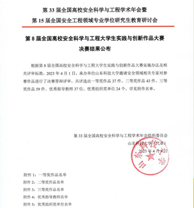 本届全国高校安全科学与工程学术年会由公共安全科学技术学会、全国高校安全科学与工程学术年会委员会主办,教育部安全科学与工程类专业教学指导委员会、中国职业安全健康协会联合主办,山东科技大学承办,是我国安全科学与工程领域最具影响力的综合性、高水平的学术交流平台,各项大赛是我国高校安全科学与工程相关专业影响力最大的全国性赛事。公司师生团队取得优异成绩,充分彰显了公司对团队建设和人才培养的高度重视,有力印证了武科大学子对“厚德博学、崇实去浮”校训的传承。