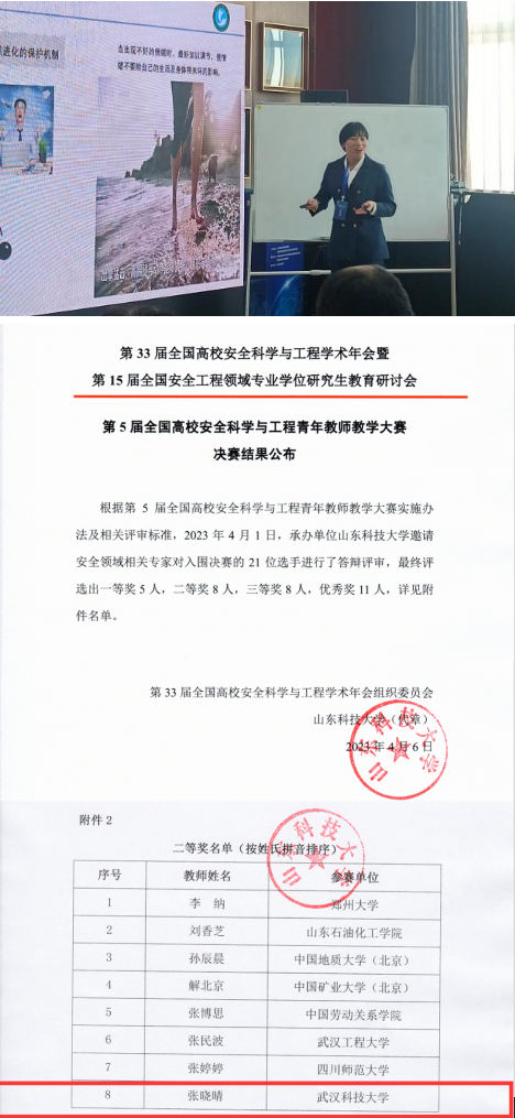 此外,在同时举行的第5届全国高校安全科学与工程青年教师教学大赛中,3044永利集团张晓晴老师成功进入决赛,并荣获二等奖。