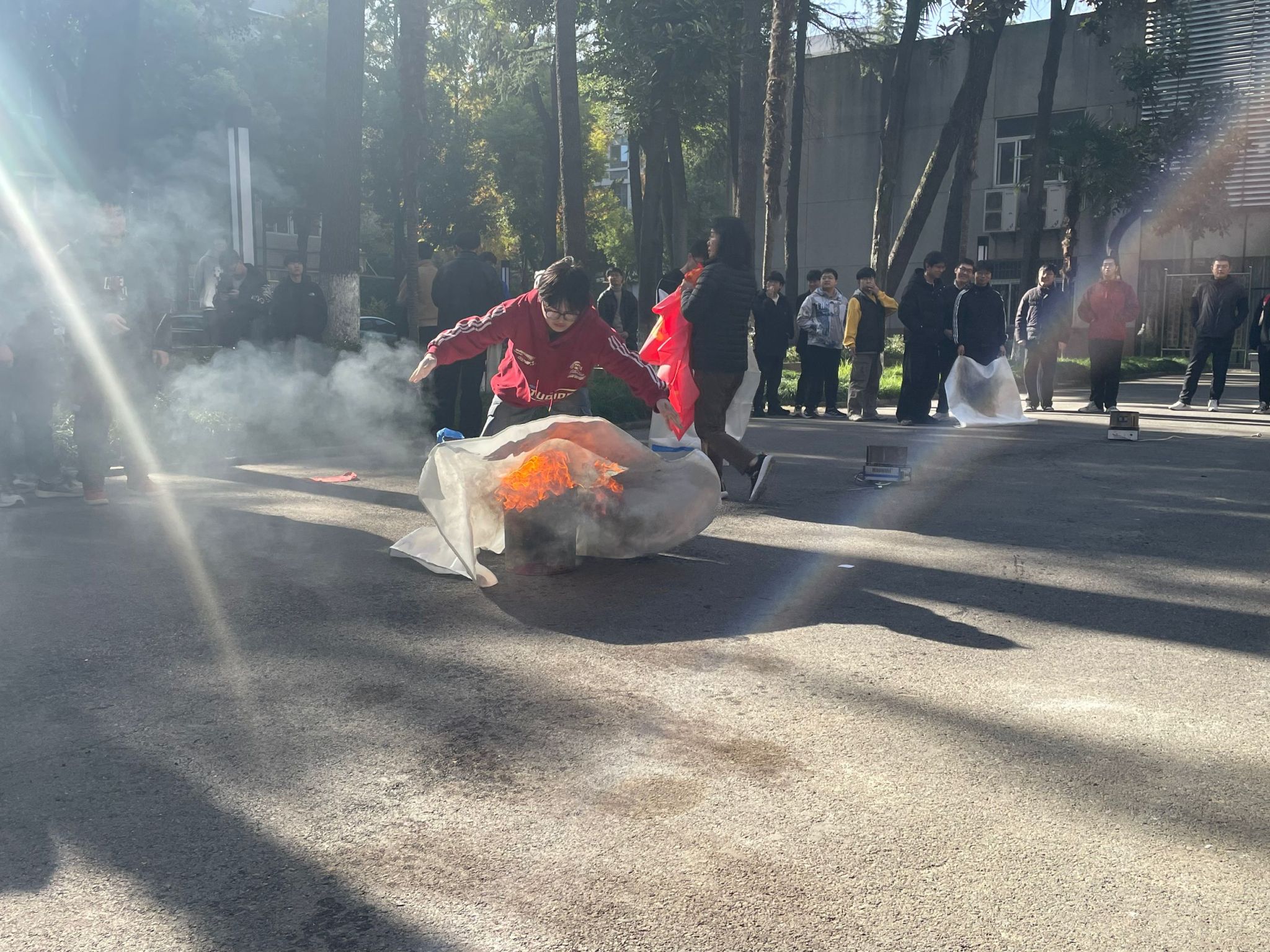 本次培训聚焦消防毯灭火技巧与火灾逃生应用,通过场景模拟、实操演练与专业指导相结合的方式,强化师生面对火情的实战能力。培训中,消防人员结合实验室典型火情案例,系统讲解消防毯的阻燃原理与规范操作流程,具体包括正确握持姿势、保持安全距离、迅速覆盖火源、围合灭火部位、静置确认火势熄灭等关键环节。现场指导教师同步提示“卷起袖口”“注意站立上风位置”等操作细节,帮助师生掌握灭火过程中的安全要点。